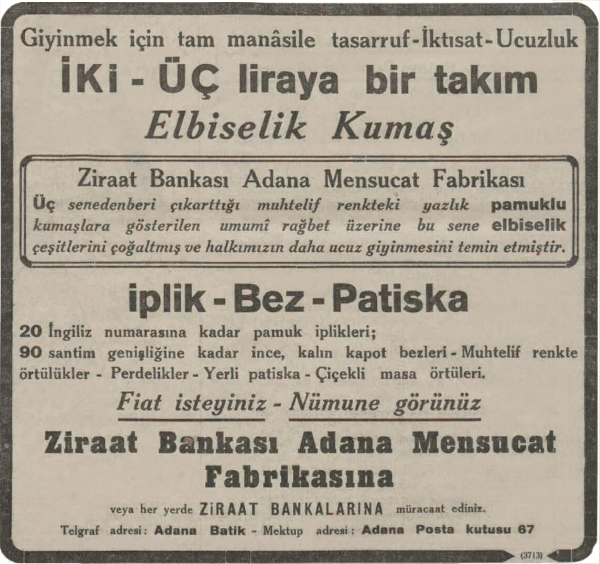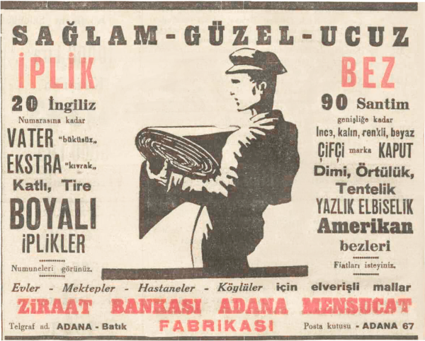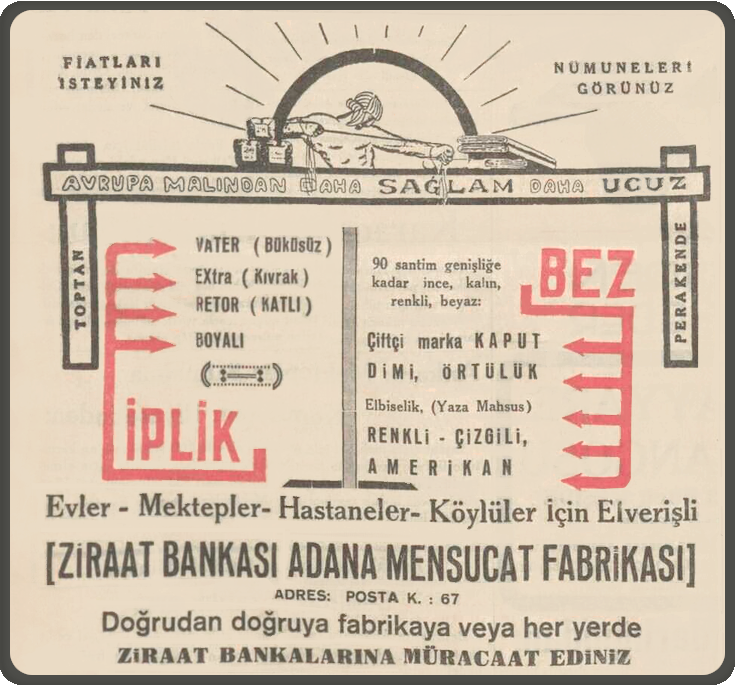 . https://www.muhtelifmuzayede.com/urun/12185798/bankacilik-tarihi-turkiye-cumhuriyeti-ziraat-bankasi-adana-mensucat-fabrikasi-su
