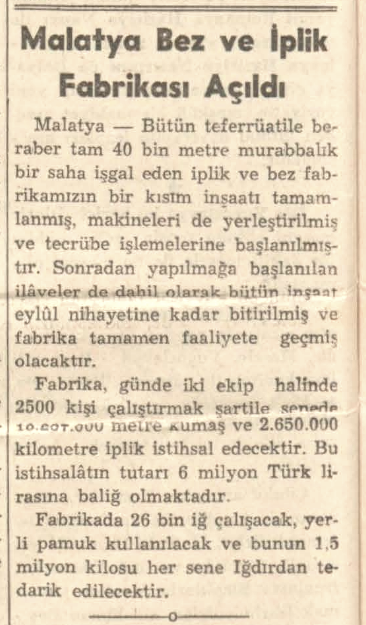 “Okuma yazma kursları açılmış, şehre ilk itfaiye teşkilatı burada kurulmuştu. Malatya’nın ilk pastanesi de yine fabrikada açılmış, bando, kreş, farklı spor branşlarında faaliyetler, işçi lokali, stadyum, hatta ilk duş tesisatının olduğu banyolar bile burada yapılmıştı. Yüzme havuzu vardı. Şehir kütüphanesinden daha nitelikli bir kütüphanenin yanında güçlü uzman hekim kadrosu ile birçok ameliyatın yapılabildiği donanımlı bir hastane de fabrikada hizmet vermekteydi. Malatya’nın ilk toplu konut uygulaması olan işçi ve memur lojmanları da yerel kimlik ve ihtiyaçlar göz önünde tutularak bahçeli ve müstakil olarak yapılmıştı.”