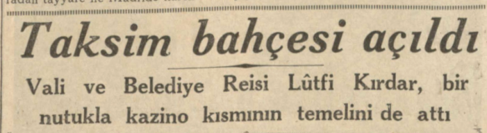 Taksim Bahçesi, erken Cumhuriyet İstanbul’unu planlayan Henri Prost tarafından, kentin 2.No.lu Parkı olarak tasarlandı. İstanbul Valisi ve Belediye Başkanı Dr. Lütfi Kırdar, Prost’tan, büyük törenlerin düzenlenebileceği bir meydan istemişti. 1909’dan beri kullanılmayan kışla 1939’da yıkıldı. 2.No.lu Park, “Taksim Bahçesi” adıyla 15 Temmuz 1939’da halka açıldı. O dönemki haberlerde parkın içinde bin kişilik restoran/gazino binasının bulunacağı ve haftanın belirli günleri konserler düzenleneceği belirtilmiş. Gazino binası ve büfenin 29 Ekim’e kadar tamamlanması planlanmış.