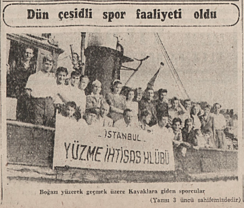 “Yüzme İhtisas Kulübü’nün Anadolukavağı ile Ortaköy arasında tertip ettiği yüzme mukavemet (dayanıklılık) yarışı dün yapılmıştır. 17 kilometrelik mesafeyi Mithat Candan 2 saat 46 dakika 2 saniyede yüzmüştür. Suad Erler 2 saat 48 dakika 3 saniyede ikinci, Salah Bayraktar 2 saat 55 dakika 31 saniyede üçüncü olmuştur.”