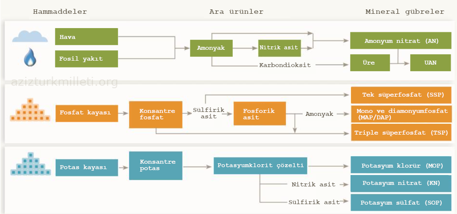 Suni gübre üretimine gerekli asıl hammaddeler, fosfat, kükürt (sülfür), potasyum, potastır. Diğer hammaddeler pirit, amonyak, sülfirik asit, fosforik asit, nafta, kömür, doğalgaz, güherçiledir. Bu maddelerin her birinin topraktan çıkarılması, ayrıştırılması ayrı çevre etkisi yaratır. II.Dünya Savaşı sonrası tüm dünyada artan Amerikan etkisi ve tarımın gelişmesiyle birlikte gübre ihtiyacının artması, doğal gübreden suni gübreye geçişi neredeyse zorunlu kılmıştır. Madenlerden çıkan baca gazlarının ayrıştırılarak suni gübre fabrikalarına hammadde olarak kullanılması, ilk yıllarda çevre zararını bir nebze azaltmışsa da, gübre fabrikalarının tehlikeleri 1970’lerde anlaşılacaktır.