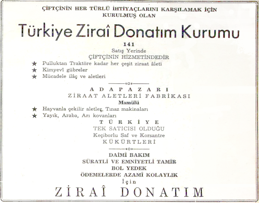 “Sayın çiftçilere, yalnızca çiftçi olduğunuzu bildiren ve mahalli mülkiye amirliğinden alınmış tasdikli bir çiftçi belgesile, istenilen kudrette (miktarda), Marshall yardım planı ile gelen traktör, biçer-döğer, soklu ve diskli pulluk, diskharrow (diskaro), mibzer (tohum ekici), kültüvatör (toprağı havalandırır) ve diğer bütün ziraat aletlerini ödemede büyük kolaylıklarla Zirai Donatım Kurumu’ndan derhal temin edebilirsiniz.