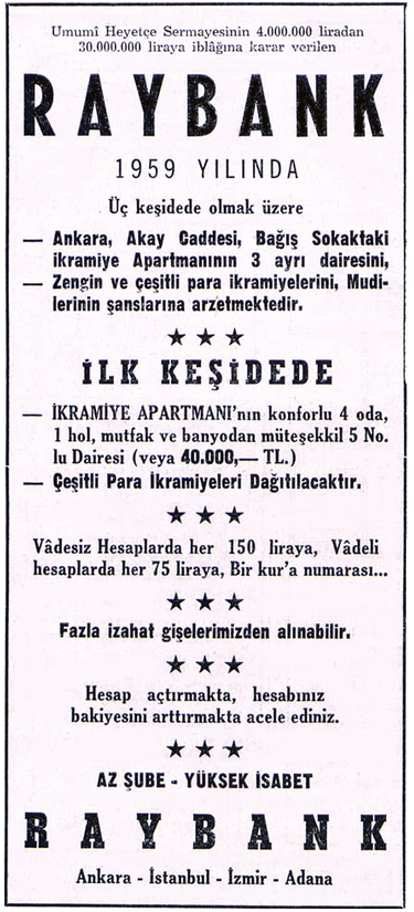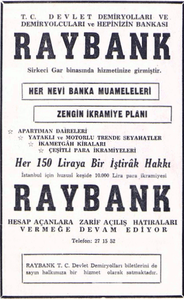 Raybank, 1956 yılında TCDD ile TCDD Memur ve İşçileri Yardımlaşma ve Dayanışma Derneği’nin katılımıyla kurulur. Banka sermayesi, Devlet Demiryolları’nda çalışan 50 binden fazla memurun maaşlarından tasarruf edilen paralardan oluşuyordu. Raybank, döneminin diğer bankaları gibi, mevduat çekmek için çekilişler düzenliyor ve daire, para ikramiyeleri gibi çeşitli ödüller dağıtıyordu.