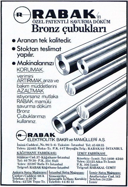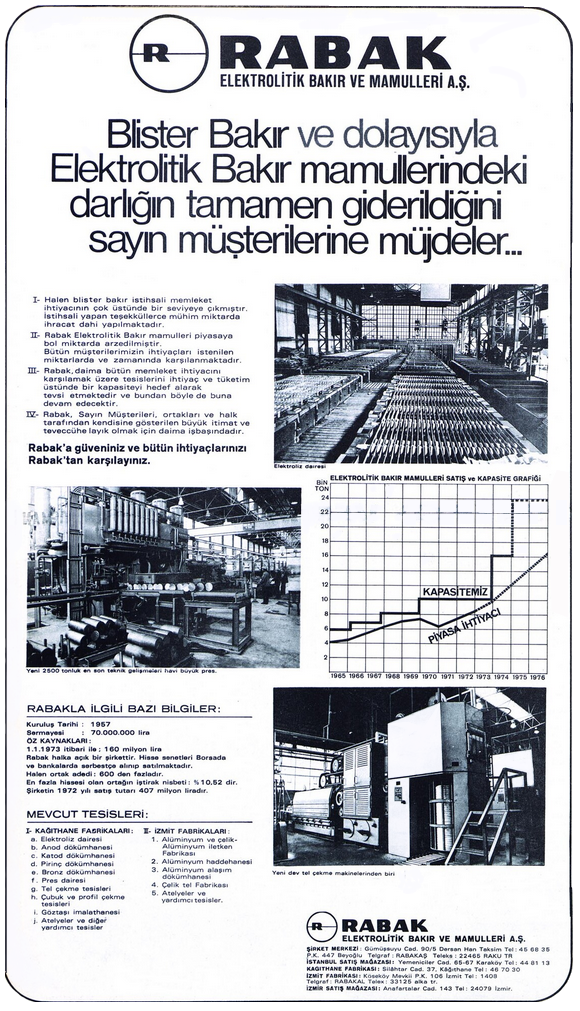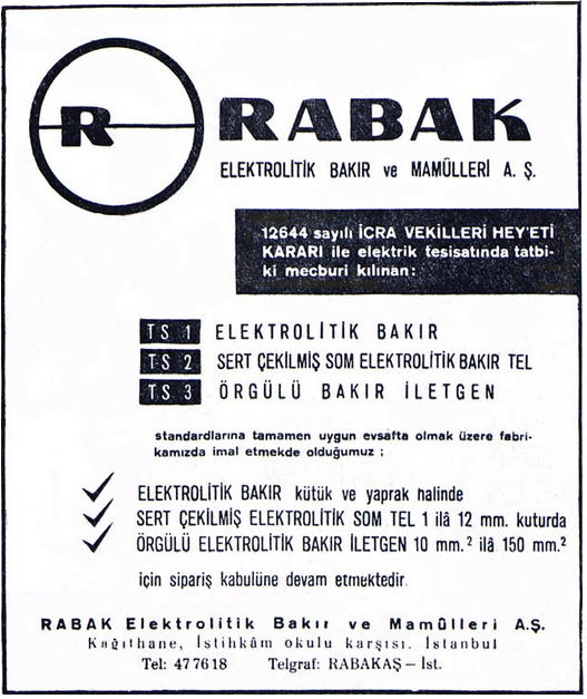 İzmit ve İstanbul Kağıthane’de ürettiği elektrolitik bakır, alaşım alüminyum örgülü iletken, alüminyum döküm ve çelik teller üreten Rabak, ürettiği ince telleri, Avrupa ve Amerika’da çeşitli ülkelere ihraç ediyordu. Rabak, 40 yılı aşan parlak döneminden sonra 1990’ların başında iflas etti.
