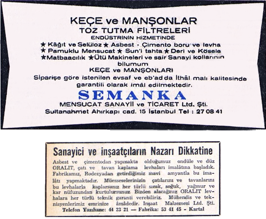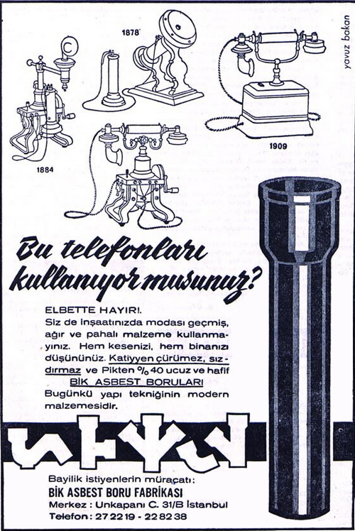 Asbest, yangın önleyici, ısı yalıtımı sağlayan son derece etkili bir maddedir. 1960-1980’ler arası konutlar için “mucize malzeme, modernliğin ifadesi” şeklinde lanse edildi, çatılarda, yalıtımda, baca ve borularda, filtrelerde, aklınıza gelebilecek her yerde ama her yerde kullanıldı. Zararları bilinmiyordu. Asbestli borular, ondülinler peynir ekmek gibi satıldı. Ne kadar yaygın kullanıldığını anlamak için 1961, 1966 ve 1978 tarihli gazete ilanlarına bakmamız yeterli.