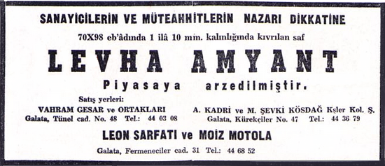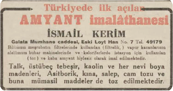Asbestin zararları yıllar geçtikçe anlaşıldıkça Avrupa ülkeleri asbest madenciliğinden vazgeçip asbesti ithal etmeyi seçtiler. Asbest 1930’larda Türkiye’de “amyant” adıyla üretilmeye ve satılmaya başlandı. 1934 tarihli Son Posta gazetesi ilanında şöyle deniyor: “Türkiye’de ilk açılan amyant imalathanesi. İsmail Kerim. Bilimum meşrubatın filtrelerinde kullanılan (filtrelik), vapur kazanlarının alelumum buhar makinelerinde ve kaloriferlerde istasyon için kullanılan (toz) ve kaba amyant hiylesiz olarak imal edilmektedir.”